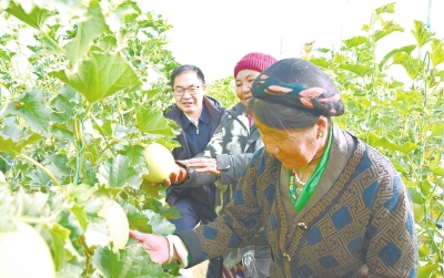 华中农业大学教授黄远(左一)带着藏族同胞在大棚里参观蜜瓜种植。