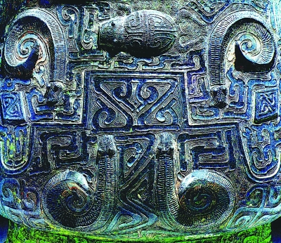 江西新干大洋洲出土的商代提梁方卣盖,现藏江西省博物馆,蛇身的纹饰单元为一个菱形方格纹加四个三角纹。这是商代最典型的蛇纹(“卣”读作“有”,是古代一种口小腹大的盛酒器具,多用于祭祀——《读+》注)。