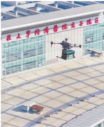 装载救命药的无人机降落在同济医院光谷院区楼顶。