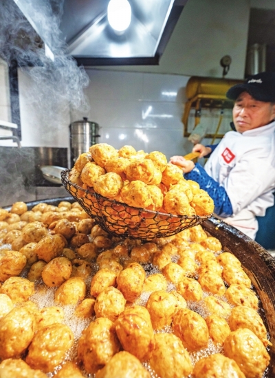 22日上午,菜馆后厨操作间,张浩把肉馅放入搅拌机内,然后双手不停,加入葱花、姜末、胡椒粉等调味料,等到开动机器搅拌后,陈来喜则观察肉馅的颜色,根据其变化不时地加入清水。乒乓球大小的肉团,放进滚烫的油锅后“滋滋”作响,炸至金黄后捞起,冒着热气的圆子散发出缕缕肉香。陈来喜用筷子夹取一颗圆子,品尝后打出分数:基本及格。