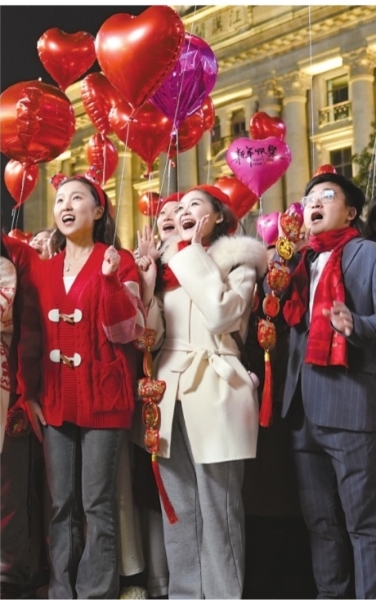 众多青年聚集在江汉关等待零点钟声敲响。