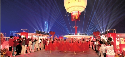 演员们在长江游船上载歌载舞。