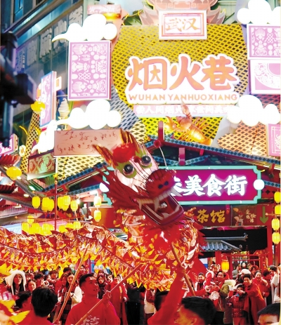 江汉路步行街灯火辉煌,舞龙表演让节日氛围拉满。
