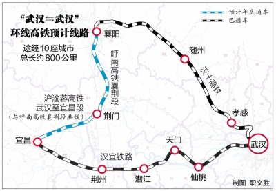 “武汉⇋武汉”环线高铁总长约800公里,依托现有汉十高铁、襄荆高铁及沪渝蓉高铁汉宜段,武汉、襄阳、宜昌三大都市圈将形成1小时高铁出行圈。