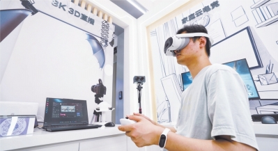 4月17日,在武汉联通江岸科技馆营业厅,工作人员正在演示通过在万兆光网上用VR眼镜“云旅游”,万兆光网让画面不卡顿更有真实感。