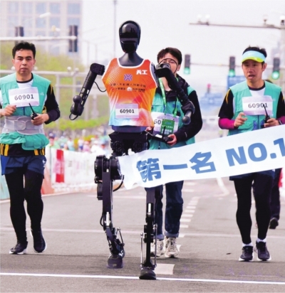 4月19日,全球首次“人机共跑”半程马拉松在京开跑。天工队选手天工Ultra(左二)在比赛中冲过终点。