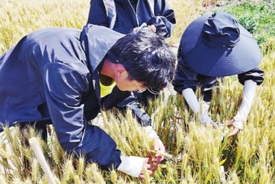 武汉大学“谱慧麦收”团队学生在农田实践基地采样。