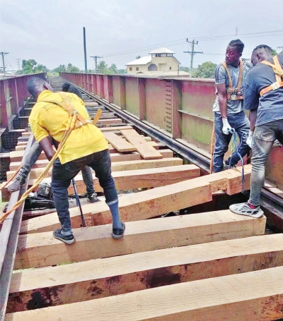 锦华盛利比里亚邦矿铁路项目,当地员工正在更换枕木。