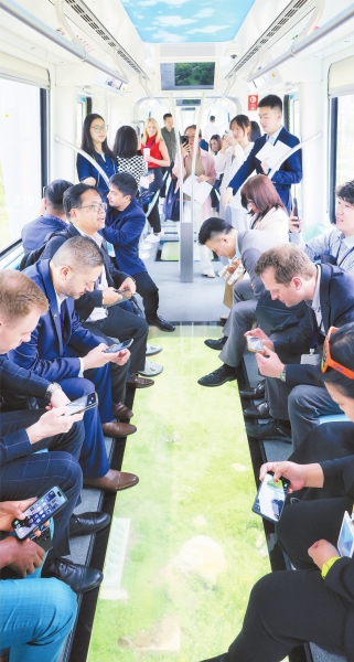 在行驶的光谷空轨上,国际友城代表们兴奋地看着脚下悬空的场景,纷纷用手机拍摄。