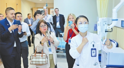 在武汉市中心医院杨春湖院区,国际友城代表们听护士讲解智慧病房。