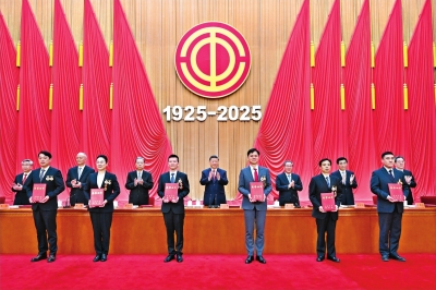 人民大会堂大礼堂气氛隆重热烈。主席台上方悬挂着“庆祝中华全国总工会成立100周年暨全国劳动模范和先进工作者表彰大会”会标,后幕正中悬挂中国工会会徽,会徽下方是“1925-2025”字标,10面红旗分列两侧。二楼眺台悬挂着标语:“以习近平新时代中国特色社会主义思想为指导,坚定不移听党话跟党走,在以中国式现代化全面推进强国建设、民族复兴伟业中充分发挥工人阶级主力军作用和工会桥梁纽带作用!”