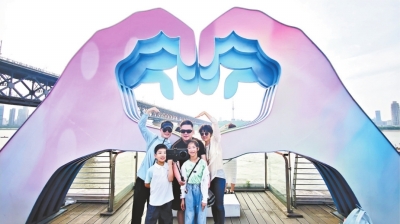 “比心”墙临江而立,游客纷纷上前拍照留念。