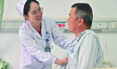 在协和医院金银湖院区肿瘤中心,一位老人中风失语,总是闹脾气,主管护师向雪妮及时处理他的不舒服,教会家属照顾技巧。向雪妮和“小伙伴”们一样,每天完成护理工作后,都会去病房走一走,与自己负责的患者们各自聊上至少5分钟,了解困难和需求。