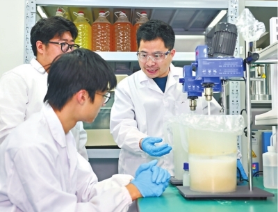 实验室里,刘培文(右)指导学生制作甲壳素纳米晶。