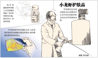 有一次,实验室的同事在用防晒霜时,给了我们灵感。我们一直在研究小龙虾深加工,虾壳里提取的甲壳素是一种天然多糖,它的衍生物甲壳素纳米晶,既能和油“做朋友”,又能和水“打成一片”,它就是一种现成的乳化剂。