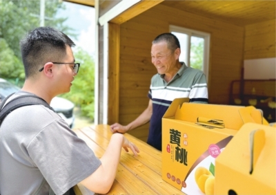 “以前路边摆摊,撑个伞不好看,车子从旁边呼啸而过,也不安全。有了这个小木屋,环境变好了,刮风下雨、风吹日晒都不怕。”果农张爱国带记者来到瓜果售卖亭内,只见里面整齐码放着一箱箱刚采摘的黄桃。