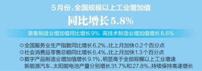 从生产端看,工业生产平稳增长,服务业增长加快。5月份,全国规模以上工业增加值同比增长5.8%。其中,装备制造业增加值同比增长9%,高技术制造业增加值增长8.6%,分别快于全部规模以上工业增加值3.2和2.8个百分点。全国服务业生产指数同比增长6.2%,比上月加快0.2个百分点。