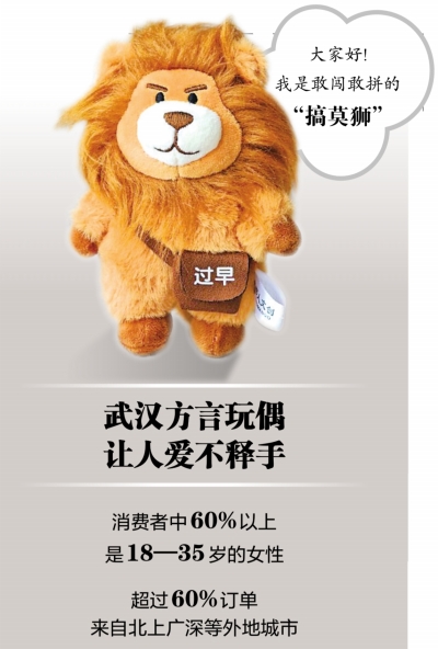 李芒果曾统计,对武汉方言玩偶爱不释手的这群消费者中,60%以上是18—35岁的女性,超过60%的订单来自北上广深等外地城市。“他们中一部分是对武汉文化好奇的外地人,另一部分是在外的武汉人、曾在武汉求学的小伙伴。”