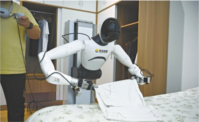 光谷东智机器人在折叠衣物。