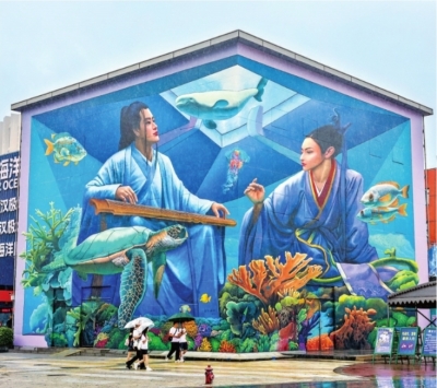 这幅壁画面积接近500平方米,为了搞出点新花样,我们团队可没少费心思。我们把湖北的“知音文化”和海洋主题巧妙融合,用青春视角重新演绎了伯牙、子期的故事。画中,伯牙和子期身着古装,在深海里与千年海龟、斑斓鱼群一同遨游,周围珊瑚轻轻摇曳,“海内存知音”的寓意随着海浪缓缓流淌。