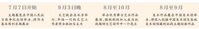 一是中央宣传部、文化和旅游部、中央广播电视总台、中央军委政治工作部和北京市将于9月3日晚在北京举行纪念中国人民抗日战争暨世界反法西斯战争胜利80周年文艺晚会。二是中央宣传部、文化和旅游部将于8月至10月组织举办纪念中国人民抗日战争暨世界反法西斯战争胜利80周年优秀舞台艺术作品展演。三是文化和旅游部、中国文联将于8月至9月在中国美术馆举办纪念中国人民抗日战争暨世界反法西斯战争胜利80周年美术作品展。
