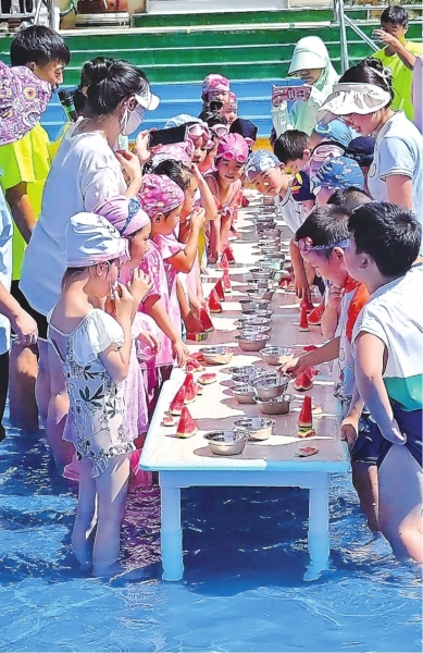 老师笑着介绍:“首先是吃西瓜比赛,吃得快的小朋友能给吃得慢的泼水。”水池里,长桌上摆满红彤彤的西瓜块。孩子们的眼睛紧紧盯着西瓜,小嘴巴微微张开,那期待又兴奋的小模样让我的心也跟着雀跃起来。
