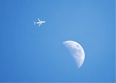 湛蓝的天幕澄澈如镜,一架客机像灵动的银燕凌月而过。这美妙绝伦的瞬间定格于江城上空。