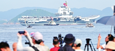 7月3日,人们在岸上拍摄海军山东舰抵达香港。