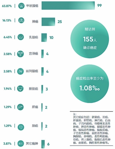 14.4万的武汉市体检人群中,爱康已随访到155人确诊癌症,癌症检出率至少为1.08‰,也就是每1000名参加体检的江城市民中至少有1人确诊癌症。其中,甲状腺癌患者数排名首位,占比超过63%。位于前列的还有肺癌、乳腺癌等。后续随访工作仍在进行中,预计会有更多确诊癌症的体检人群被发现。