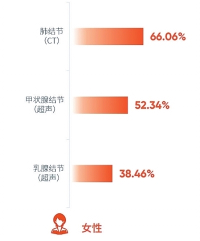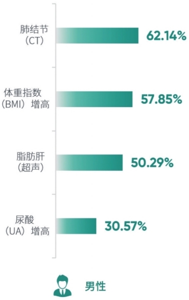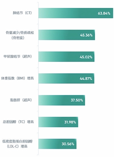 排除与性别相关的异常结果,肺结节空降武汉市体检人群体检异常结果“榜首”,检出率63.84%。往下依次为骨量减少/骨质疏松、甲状腺结节、体重指数增高、脂肪肝、总胆固醇增高和低密度脂蛋白胆固醇增高,检出率均超过三成。