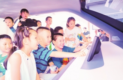 在东风汽车全球创新中心展厅,孩子们体验最新一代智能座舱。