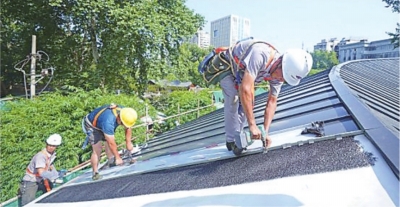 汗水不时从额头渗出,王志波擦把汗接着再干。记者伸手摸了摸之前铺好的金属瓦,感觉有点烫手。屋顶倾斜度约为40摄氏度,为安全起见,他和工友们都穿着防滑鞋作业。