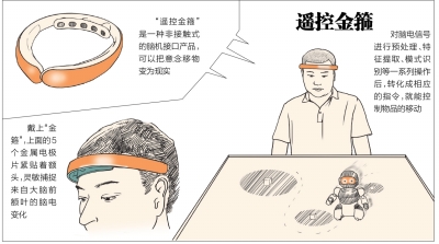 如今,一款由科学家设计的“遥控金箍”把这个神奇技能变为现实。它是一种非接触式脑机接口,金色圆环的外形看起来就像一个“金箍”。戴上它后,佩戴者就可以用“意念”遥控物品。