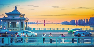 盛夏汛期,长江水位上涨,江面变得宽阔,人们来到桥畔,亲近江水,欣赏桥景。桥梁,不再只是过江通道,它成为武汉人日常生活的一部分。