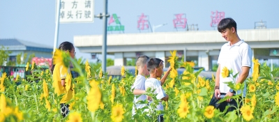 东西湖收费站旁边的向日葵花海引来市民游玩。