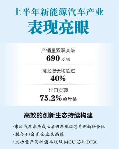 翻开中国汽车工业协会最新发布的“半年报”,新能源汽车产业表现亮眼——产销量双双突破690万辆,同比增长均超过40%,市场渗透率持续提升,出口实现75.2%的增幅。