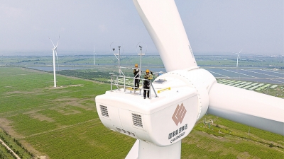 连日来,天津迎来持续高温天气,电力保供进入“迎峰度夏”关键期。在国家能源集团天津龙源新能源有限公司大苏庄风电场,工作人员在风电机组顶部进行检修。