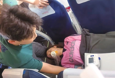 “她精神很差,呼吸困难、脉搏细弱,神志逐渐涣散,瞳孔直径也略有放大,情况相当危险。”孙毅杰回忆说。根据经验,他判断该乘客很可能是“体位性低血压”,当即和机组人员一道清空周边座椅,让患病乘客平躺下来。同时,机组人员拿来急救箱和氧气瓶,孙毅杰为她查体和测体征,并给她吸氧、口服糖水并及时调整氧流量。