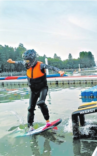 成都大学生张浩然在东湖训练水翼。