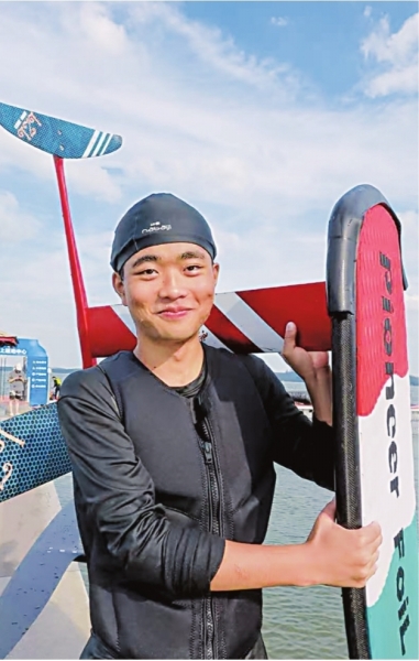 20岁的张浩然目前是成都一所大学大二学生。去年暑假,他在网上看到了水翼的视频。从未接触过水上运动的张浩然被这项运动吸引,“感觉就像是在御剑飞行,非常酷”。