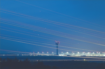 起飞的货运飞机陆续划破夜空,机身上的示意灯留下绚丽的光轨。