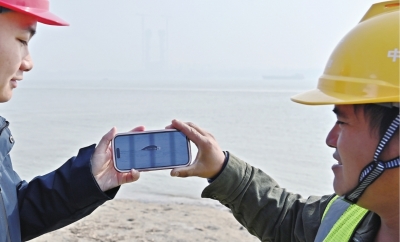 2023年12月27日,双柳长江大桥建设者廖吉学向工友们展示他用手机拍到的长江江豚逐浪嬉戏的照片。