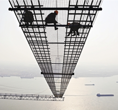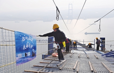 2024年12月13日,施工人员在双柳长江大桥铺设猫道。为防止施工材料掉进长江,施工人员在猫道上铺设了密实的钢网。