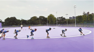 桃花岛体育公园里,孩子们正在训练轮滑。