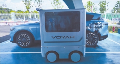 在岚图汽车科技有限公司园区示范站,评议员看到了关于智能充电的未来想象——爱车不仅可以自动充电,还有机器人帮车主完成充电。