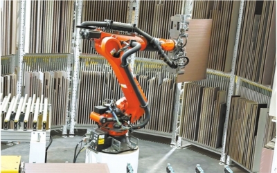走进蔡甸经济开发区欧派家居华中智能制造基地,5台机械臂一字排开,舞动长臂,从上千种不同型号的板材中精准筛选出订单所需型材,配板、送料、开料、封边……一块块板材最终被生产成不同规格柜板。