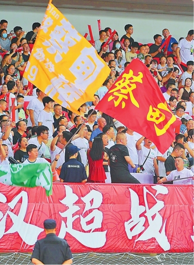 蔡甸区代表队、武汉经开区代表队球迷摇旗助威。
