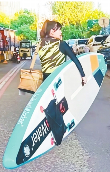 此后,代黎每周一、三、五下午固定前往古田桥下送水上外卖,16时左右做好准备工作。她一手挎着外卖箱,一手抱着桨板走在路上,不少路人一眼就认出来——“那个送水上外卖的老板来了。”为方便感兴趣的人联系,她在外卖箱上特意贴着水上外卖的预订方式。