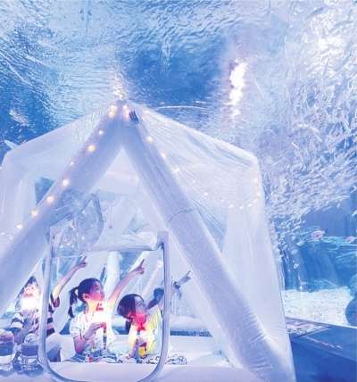 和10000+动物一起入眠是一种什么样的体验?在武汉极地海洋度假区,夜宿海洋馆成为今夏亲子家庭的热门之选。晚上9时30分熄灯后的武汉极地海洋度假区静悄悄,在蔚蓝的“海底隧道”旁,孩子们搭起白色气垫帐篷,挂上小夜灯,与游弋的鱼群、憨态可掬的白鲸共眠。当孩子们看见有的海鱼停止游动悬浮在水中,带队老师轻声解释,海鱼这也是在睡觉。