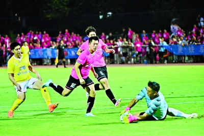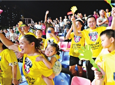 8月24日,汉超江汉区代表队对长江新区代表队的比赛在塔子湖体育中心足球场举行,赛场内外观众欢呼声不断,为心仪球队助威加油。